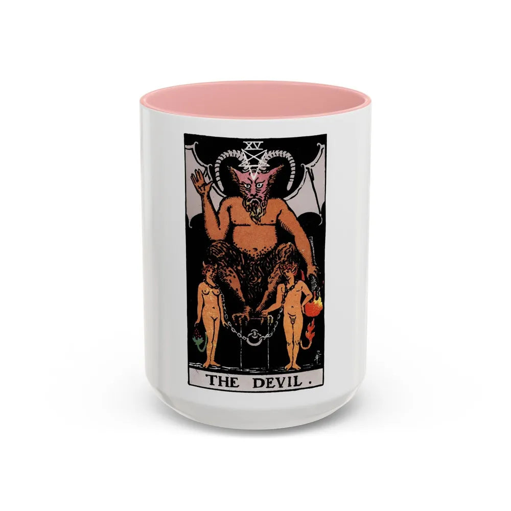 The Devil (Tarot Card) The Devil is a major arcana card, numbered 15, in traditional Tarot decks. This card often symbolizes temptation, desire, and addiction, as well as enslavement or being trapped by one's own passions. It represents an extreme form of worldly experience dominated by sensual pleasures. The Devil is typically depicted with a human body and the head of a goat, bound figures at his feet, and carrying a trident or scorpion tail. Its reversed position may suggest escape from bondage, control, or the breaking of a bad habit. The interpretation of this card can vary greatly depending on the context of the question asked during a Tarot reading.