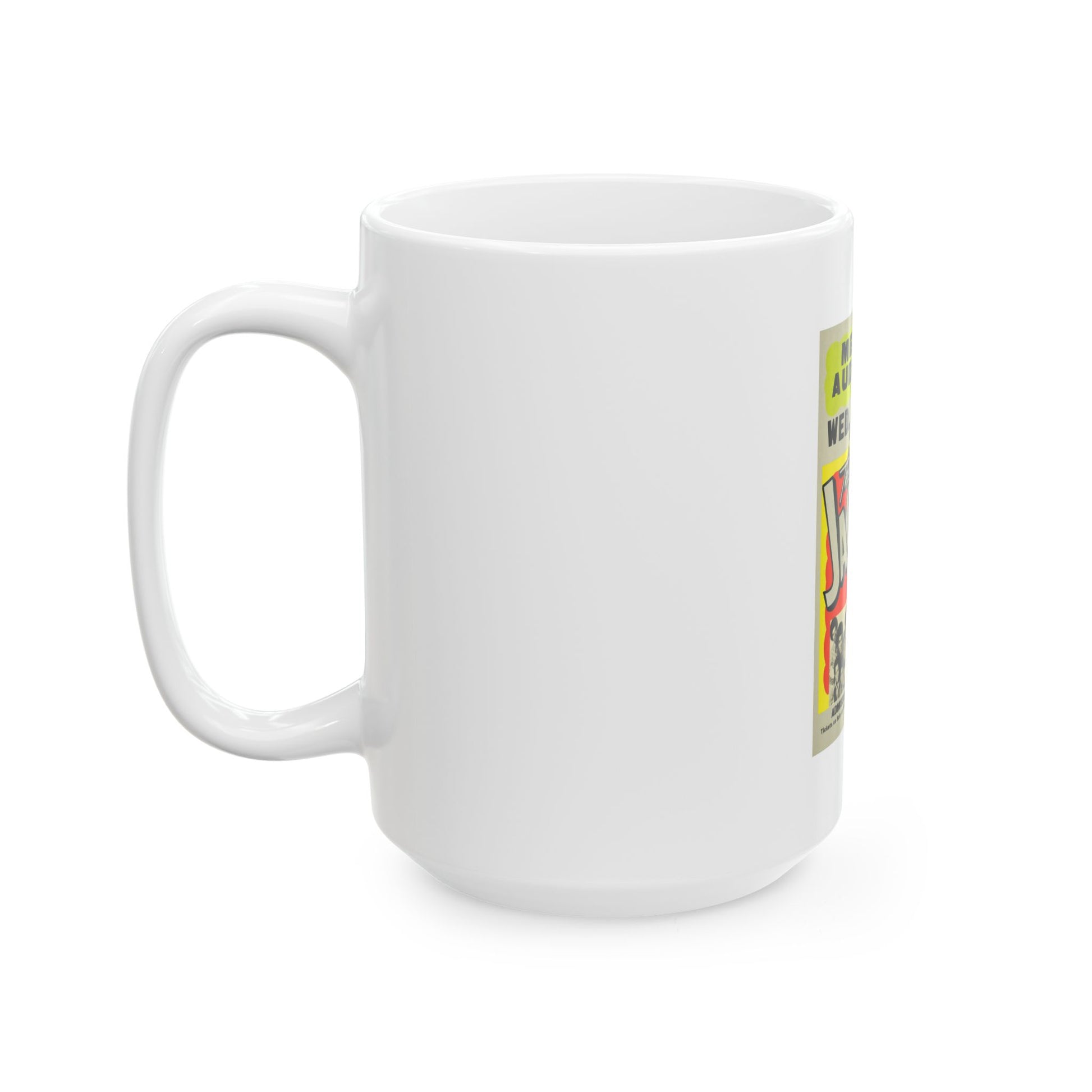 Sturdy white ceramic mugs available in 11 oz (β‰ˆ330 ml) and 15 oz (β‰ˆ440 ml), with a glossy finish and comfortable C-handle β€” microwave and dishwasher safe, and made from lead- and BPA-free materials.