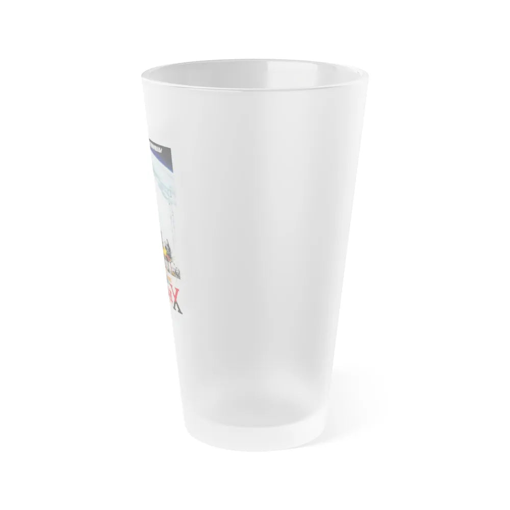 Frosted pint glass (16 oz / ≈0.47 L) with a soft matte finish and semi-translucent, one-sided print. Tough enough for bar and restaurant use, dishwasher safe, and BPA-free — a modern take on classic pintware.