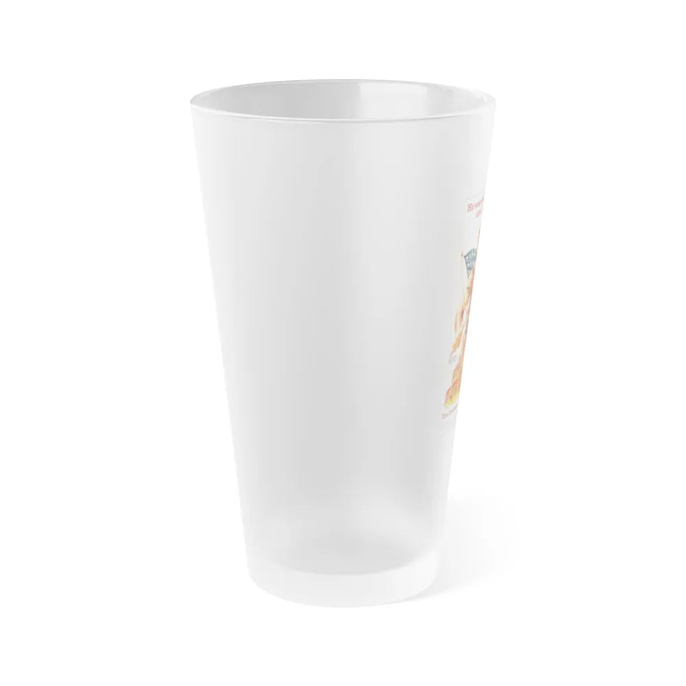 Frosted pint glass (16 oz / ≈0.47 L) with a soft matte finish and semi-translucent, one-sided print. Tough enough for bar and restaurant use, dishwasher safe, and BPA-free — a modern take on classic pintware.