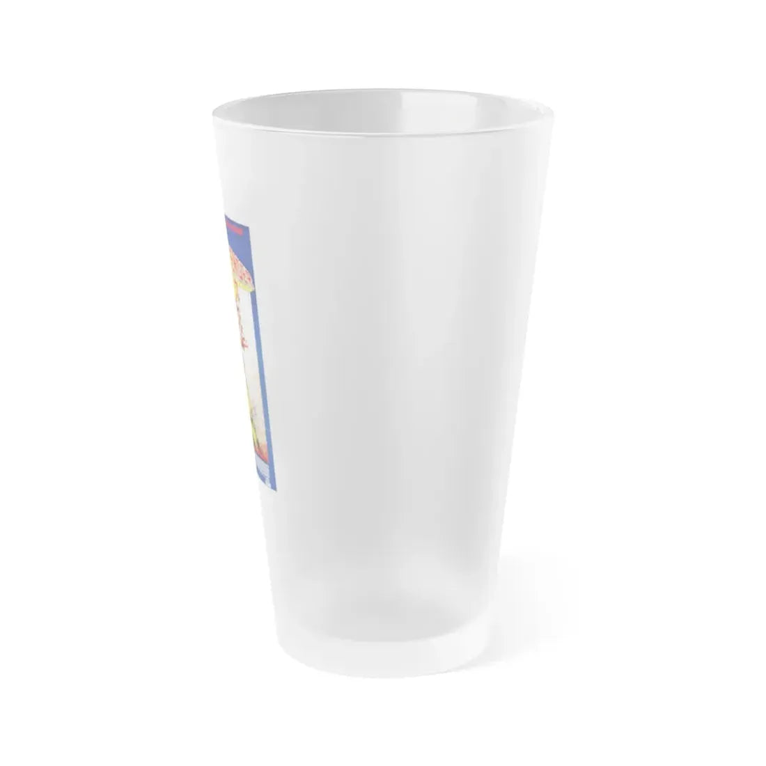 Frosted pint glass (16 oz / ≈0.47 L) with a soft matte finish and semi-translucent, one-sided print. Tough enough for bar and restaurant use, dishwasher safe, and BPA-free — a modern take on classic pintware.