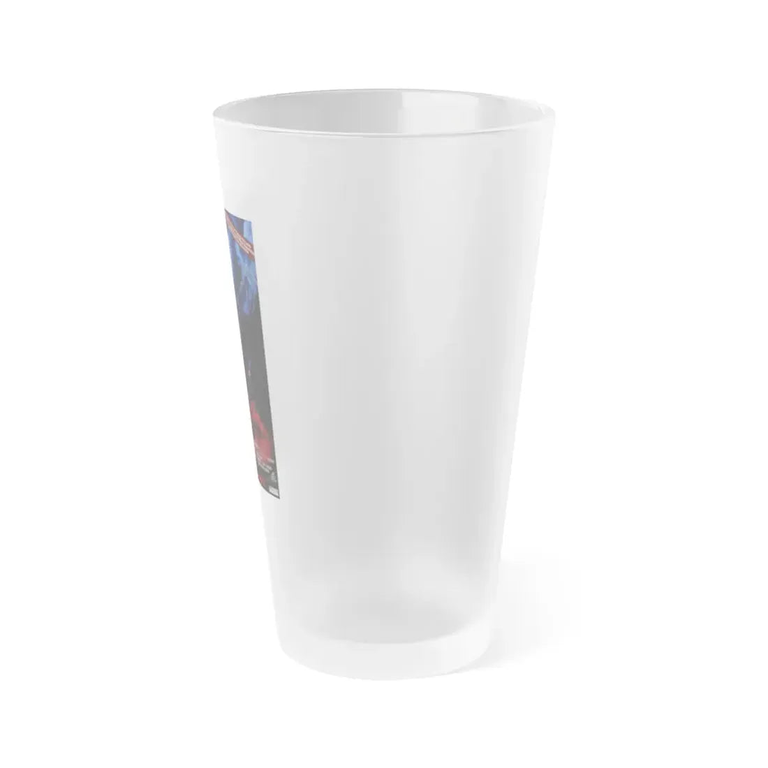 Frosted pint glass (16 oz / ≈0.47 L) with a soft matte finish and semi-translucent, one-sided print. Tough enough for bar and restaurant use, dishwasher safe, and BPA-free — a modern take on classic pintware.