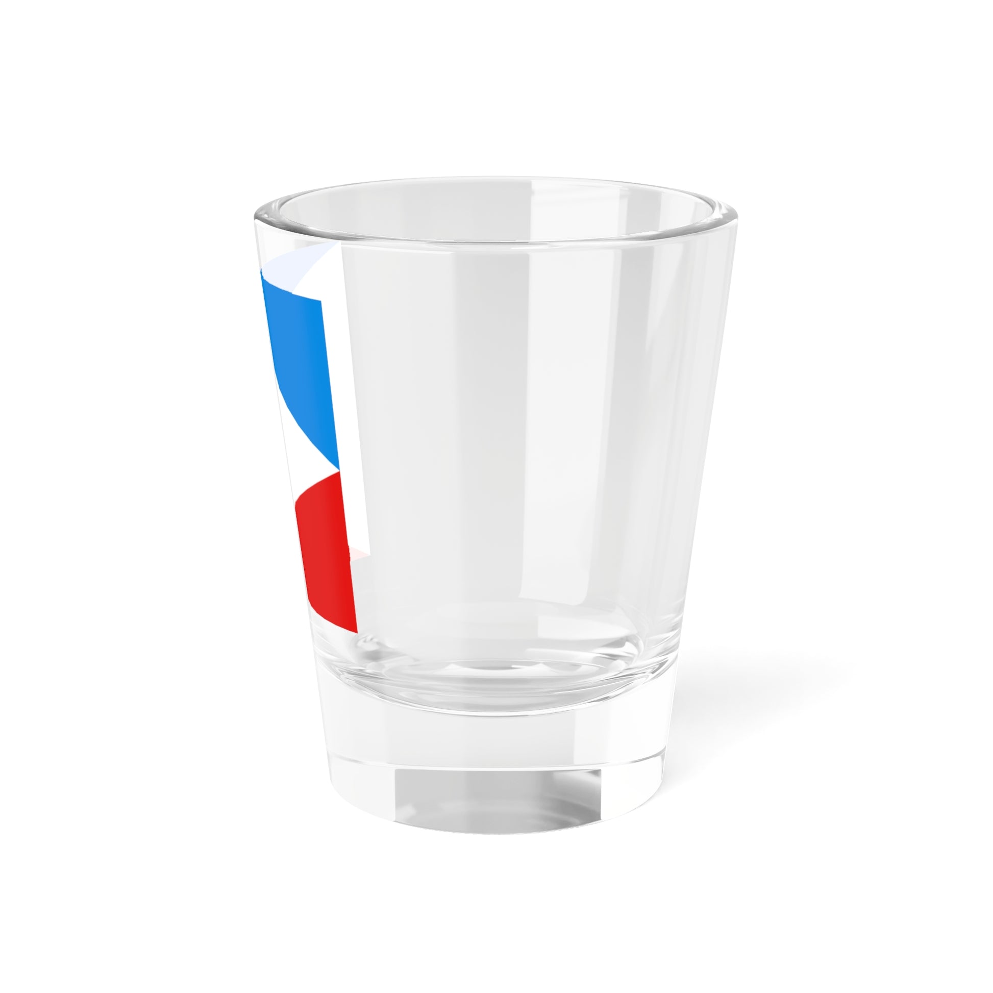 This shot glass showcases the official flag of the village of Trostynka, located in the Vasylkiv district of Kyiv Oblast, Ukraine. The design is directly taken from the village's heraldic flag.