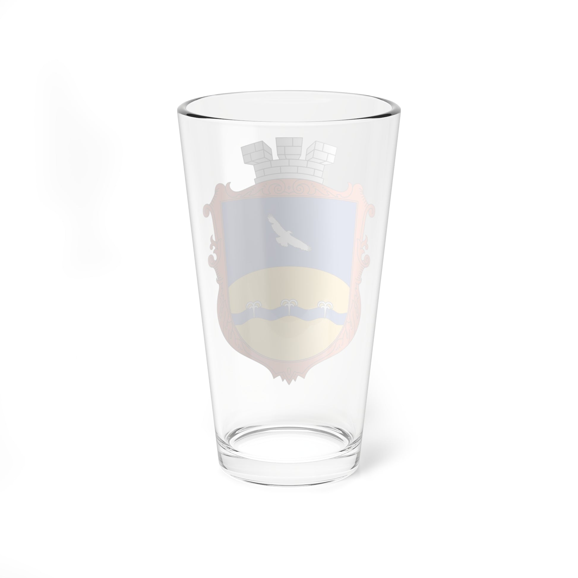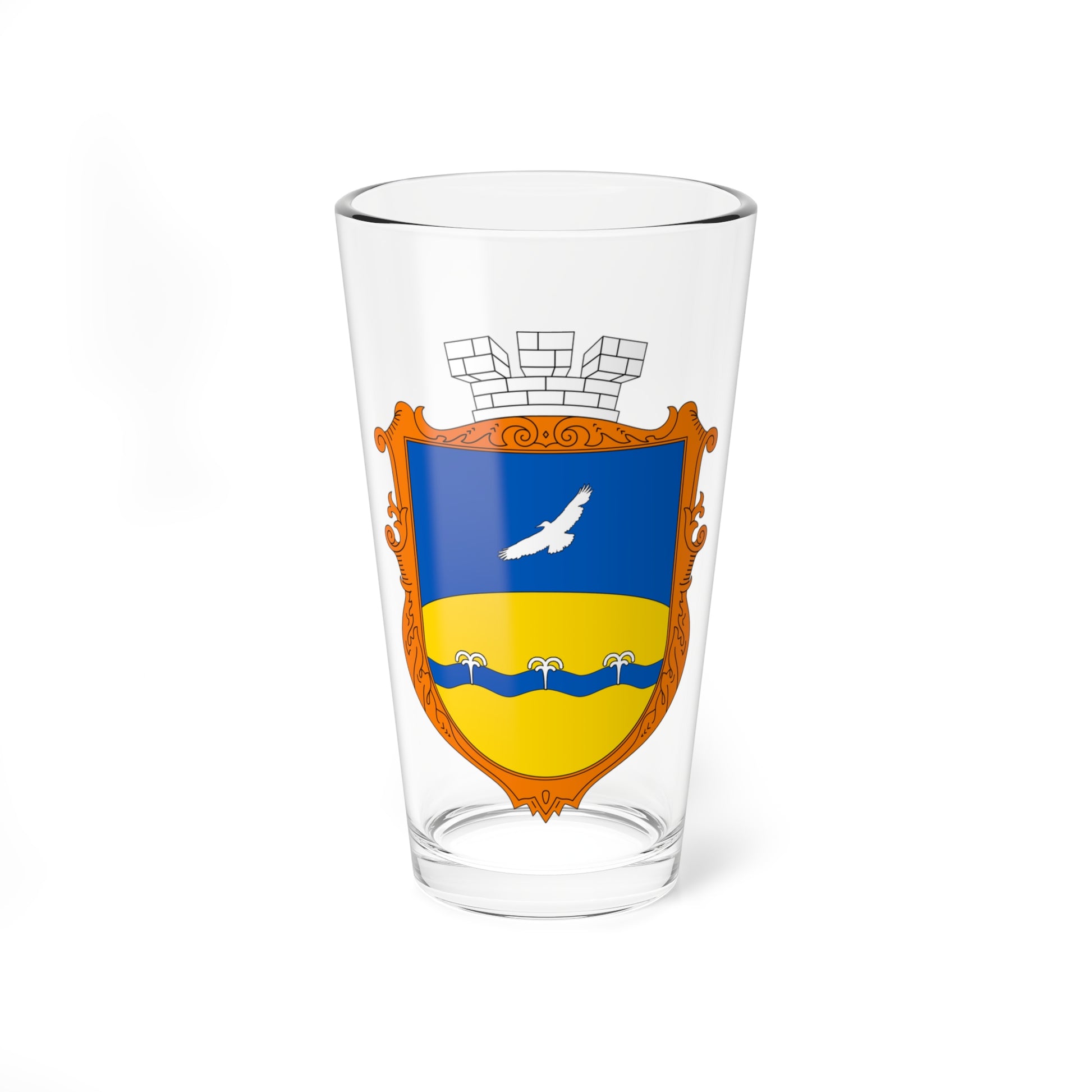 This pint glass showcases the coat of arms of Volnovakha, Ukraine, a visual tapestry woven with symbols of history, nature, and civic pride.