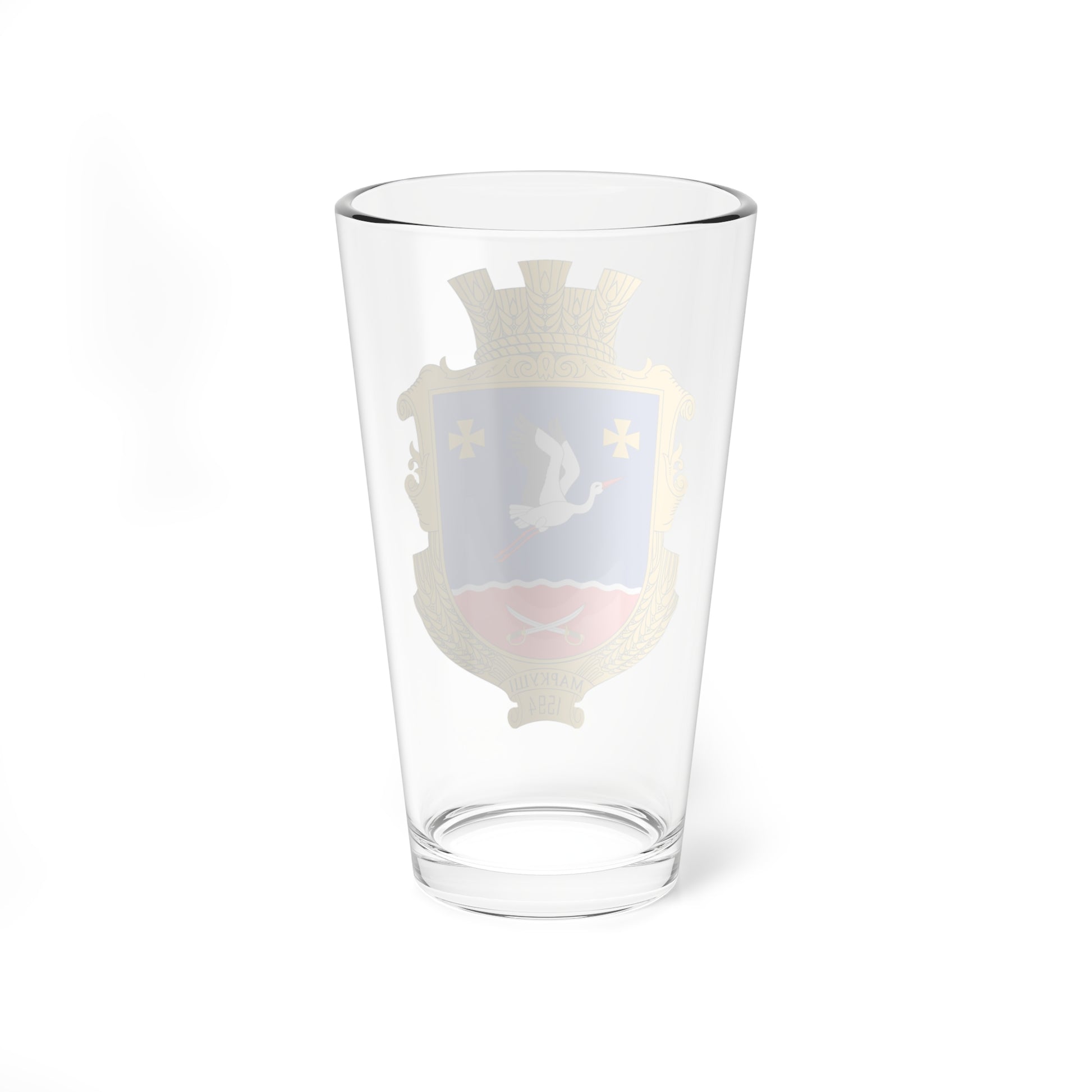 This pint glass showcases the heraldic emblem of Markushi, a village nestled in the Berdychivskyi District of Ukraine. The artwork is a visual representation of the village's identity and history, following established Ukrainian heraldic traditions.