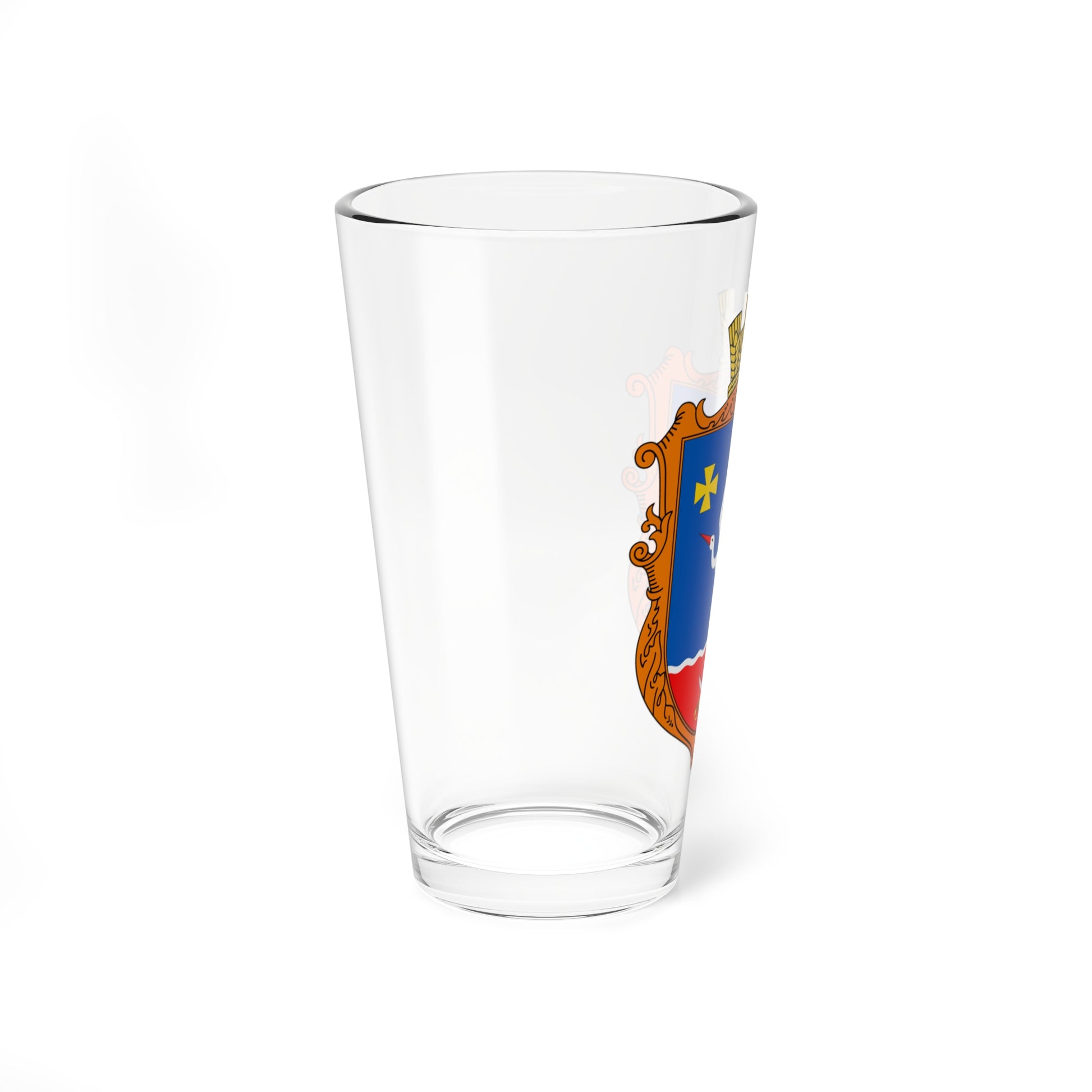 This pint glass showcases the coat of arms of Markushi, a village in the Berdychivskyi District of Ukraine. The design, a striking representation of local heritage, is centered around a shield divided horizontally.