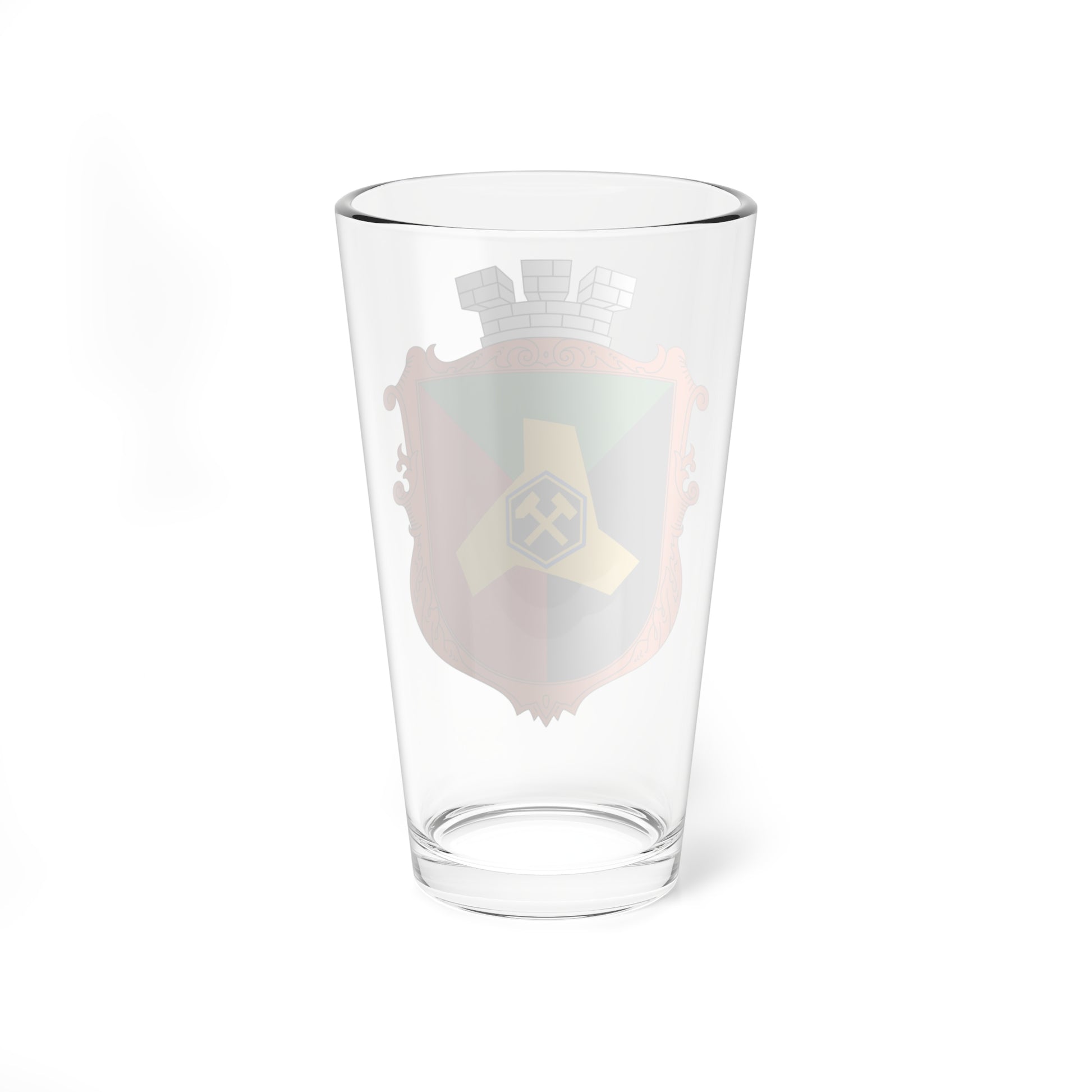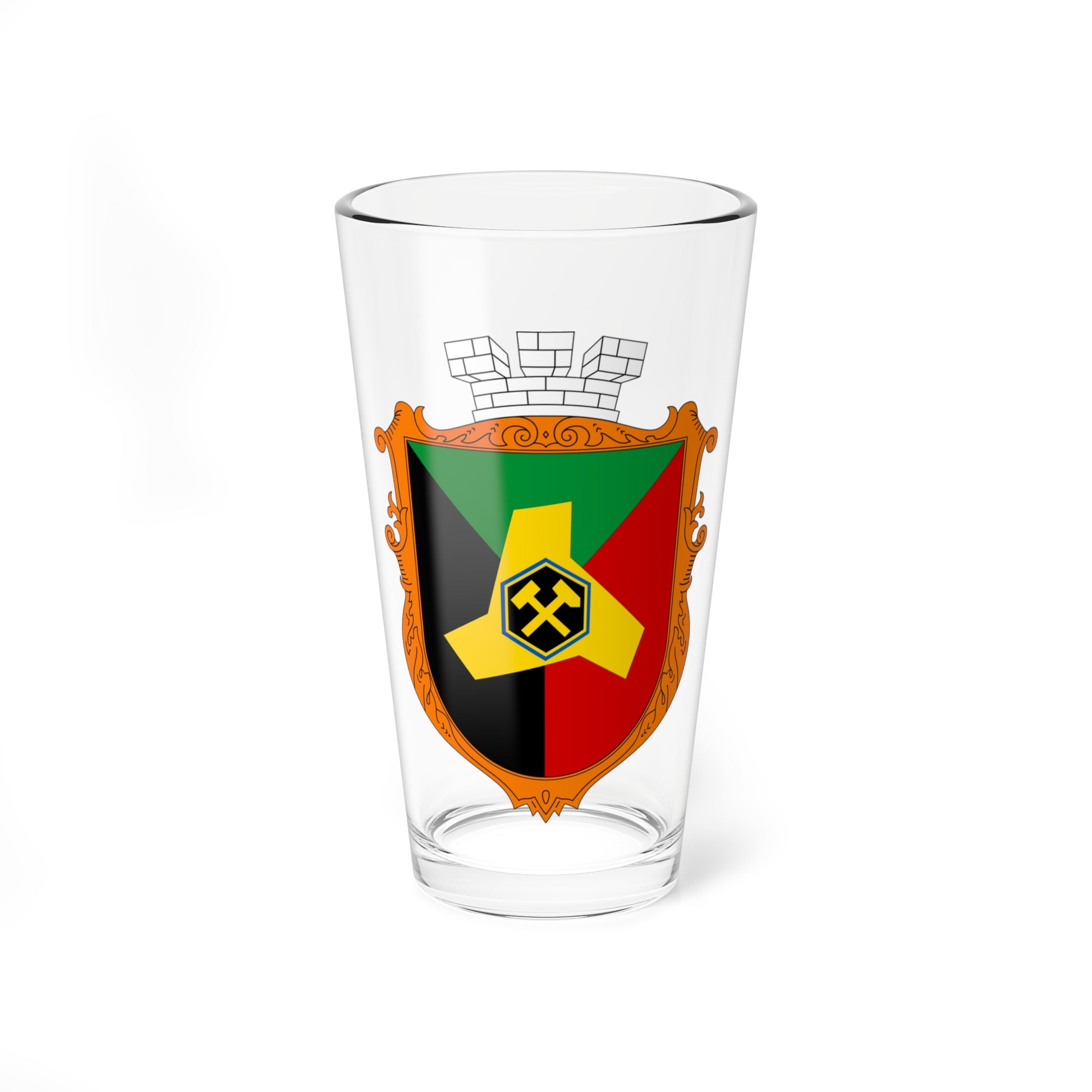 This pint glass showcases the official coat of arms of Toretsk, a city in the Donetsk Oblast of Ukraine. The design, executed under the "Unified Heraldic Template" (UHT) guidelines, presents a striking and meaningful visual representation of the city's identity.
