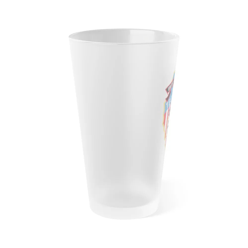 Frosted pint glass (16 oz / ≈0.47 L) with a soft matte finish and semi-translucent, one-sided print. Tough enough for bar and restaurant use, dishwasher safe, and BPA-free — a modern take on classic pintware.