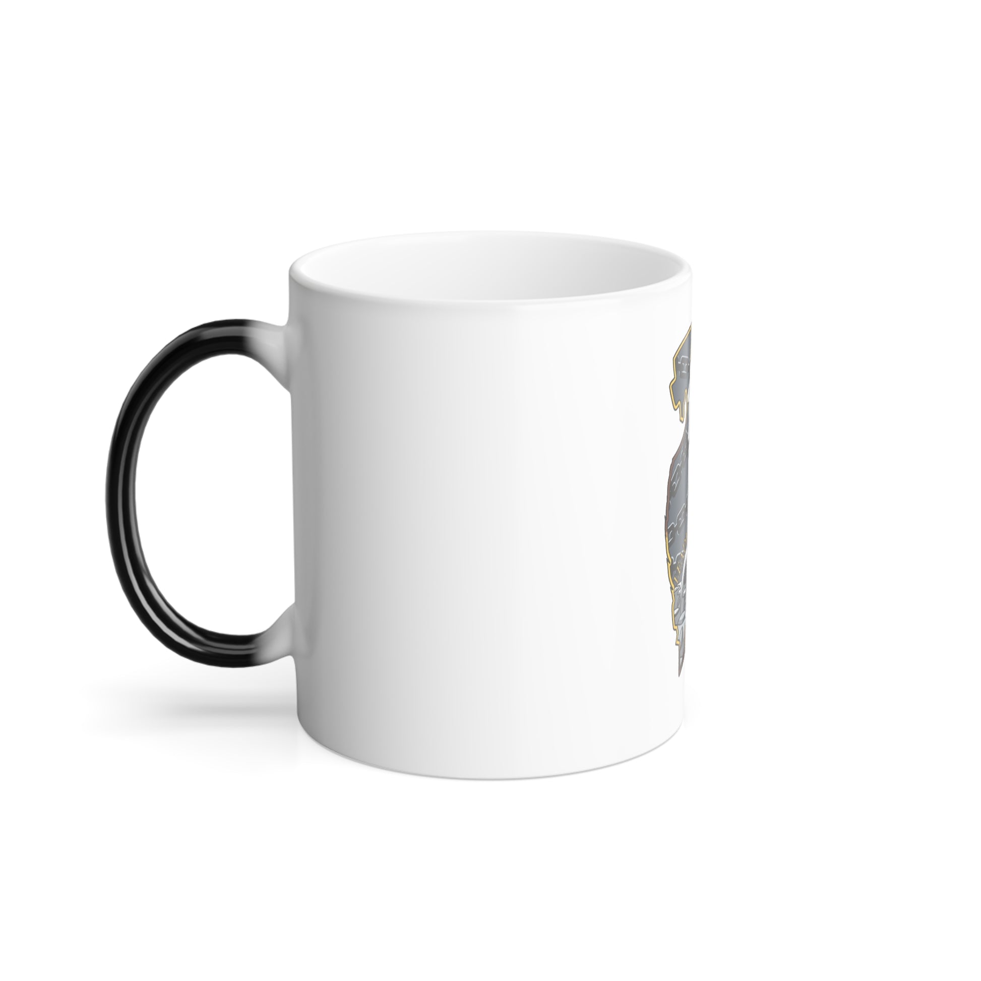 Color-changing ceramic mugs with a glossy finish, black exterior, and white interior. Available in one size: 11 oz (≈330 ml). Heat-reactive coating reveals your custom design when filled with hot liquid. BPA- and lead-free, with a comfortable C-handle.