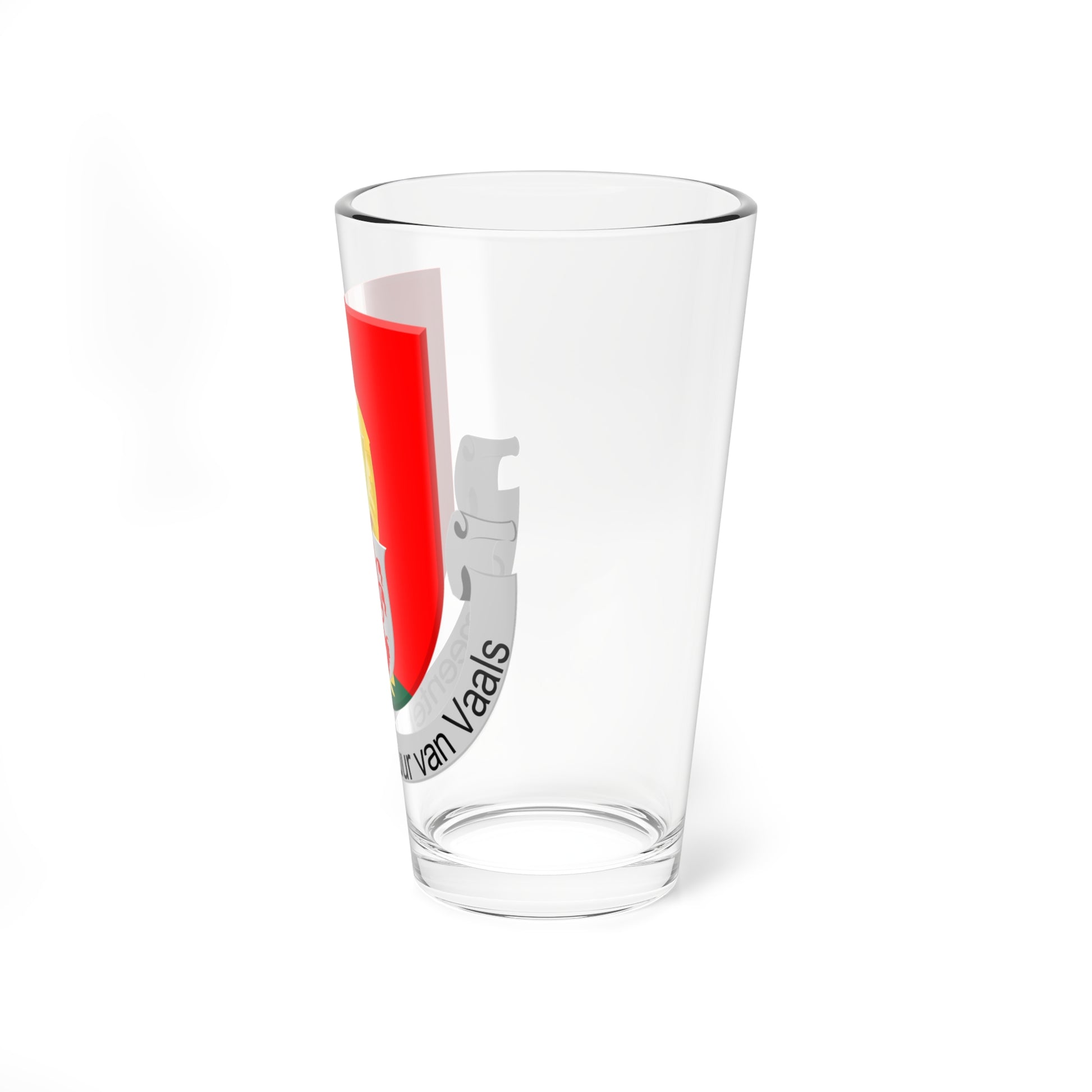 This pint glass showcases the heraldic artistry of the Wapen van Vaals, the coat of arms of the Dutch municipality of Vaals. The design is a vibrant and symbolic display of medieval heraldry.