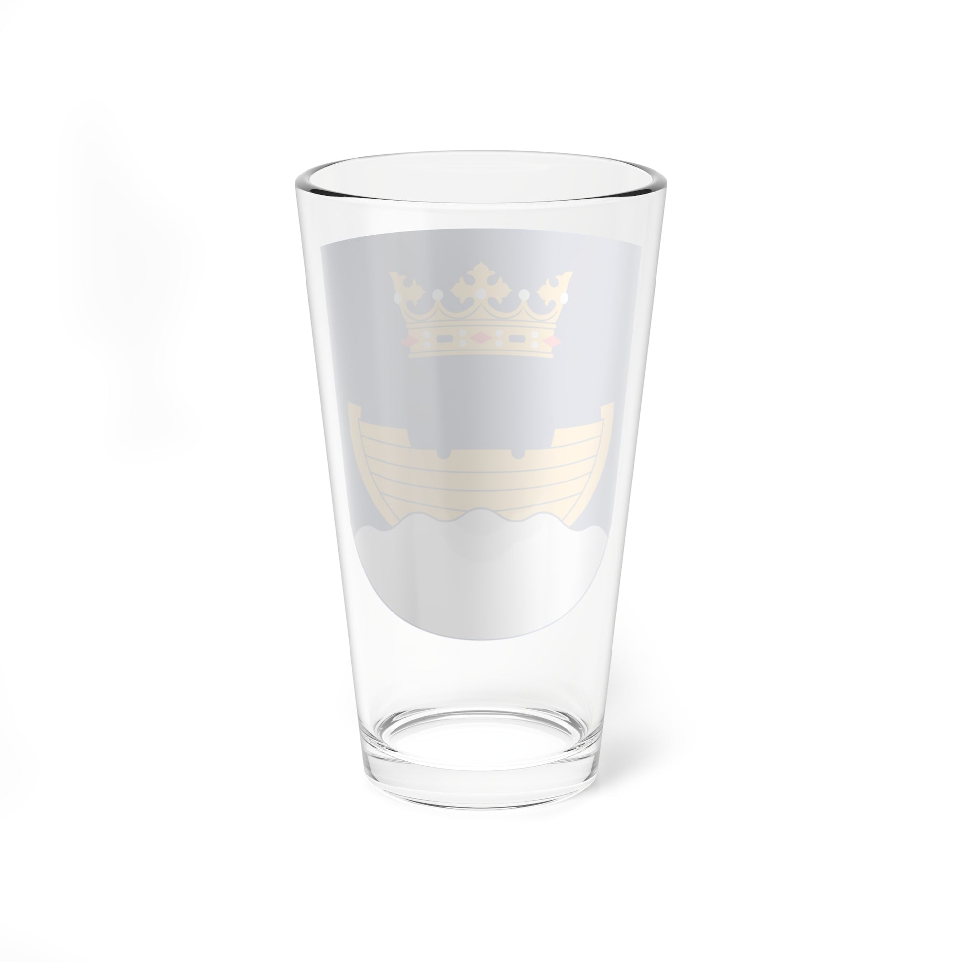 This pint glass showcases the esteemed coat of arms of Helsinki, Finland, a symbol steeped in history and maritime significance. The design, rendered in a classic heraldic style, centers on a visually striking arrangement that embodies the city's essence.
