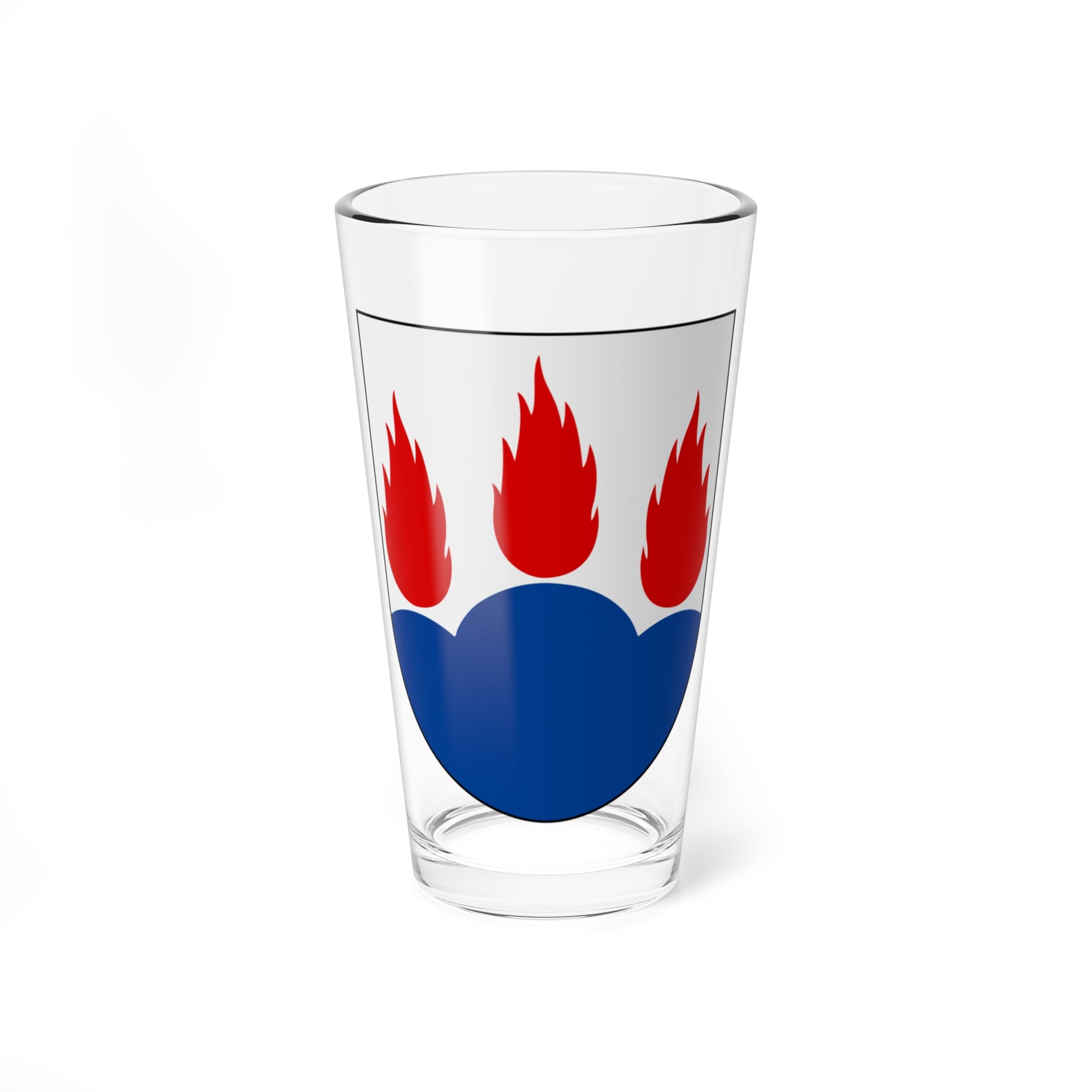 This pint glass showcases the heraldic emblem of Västmanland, a province in central Sweden, a design steeped in history and symbolism.