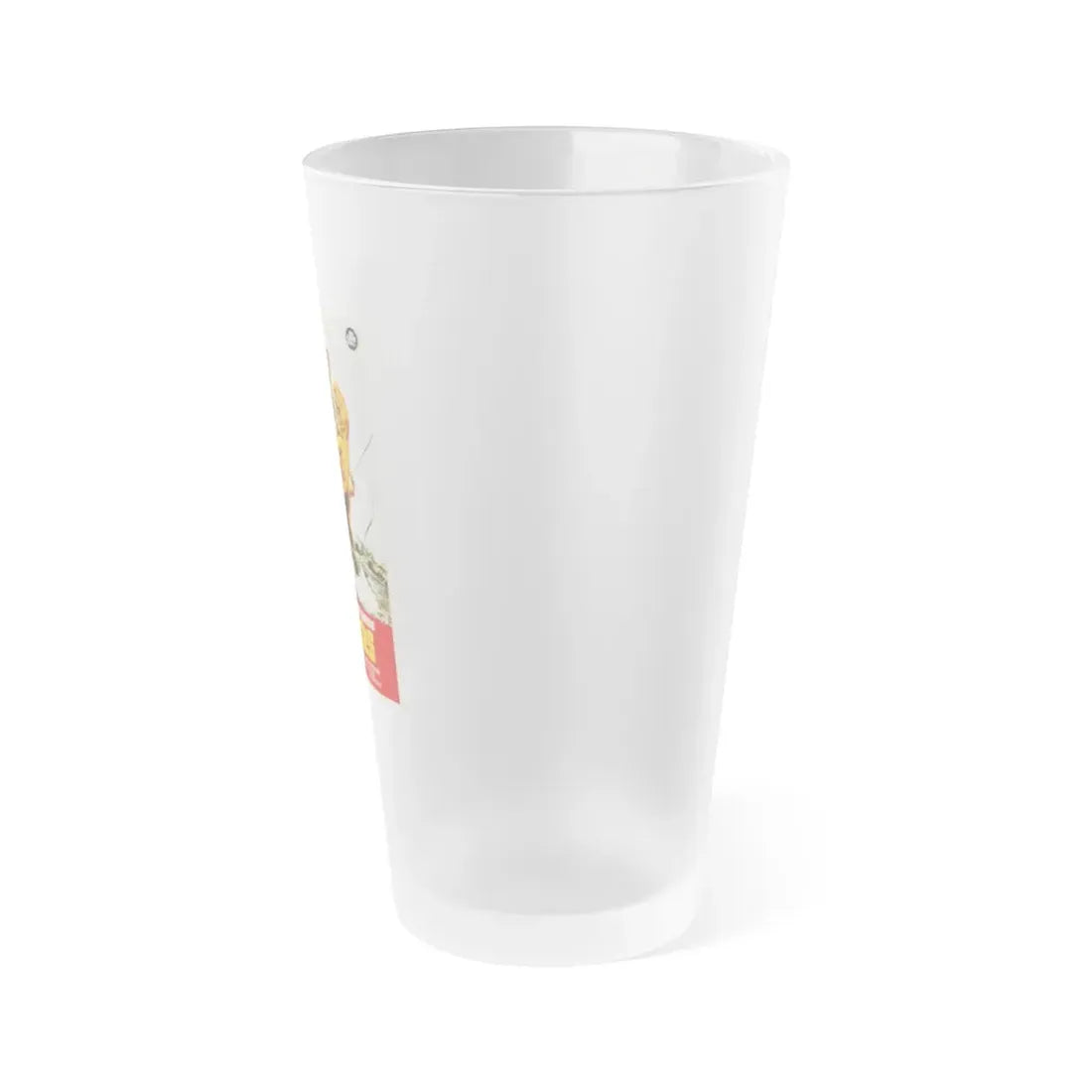 Frosted pint glass (16 oz / ≈0.47 L) with a soft matte finish and semi-translucent, one-sided print. Tough enough for bar and restaurant use, dishwasher safe, and BPA-free — a modern take on classic pintware.