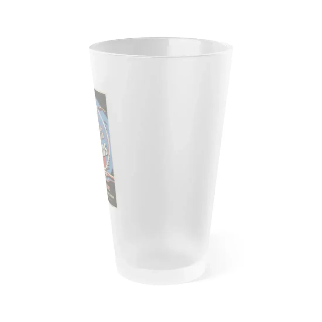 Frosted pint glass (16 oz / ≈0.47 L) with a soft matte finish and semi-translucent, one-sided print. Tough enough for bar and restaurant use, dishwasher safe, and BPA-free — a modern take on classic pintware.